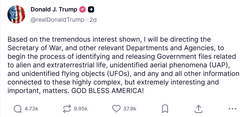 „Na základě obrovského zájmu veřejnosti nařizuji… zahájit proces identifikace a zveřejnění vládních záznamů týkajících se mimozemského života, neidentifikovaných vzdušných jevů (UAP) a neidentifikovaných létajících objektů (UFO) a jakékoliv další informace spojené s těmito vysoce komplexními, ale extrémně zajímavými a důležitými záležitostmi. Bůh ochraňuj Ameriku!“ napsal Trump.